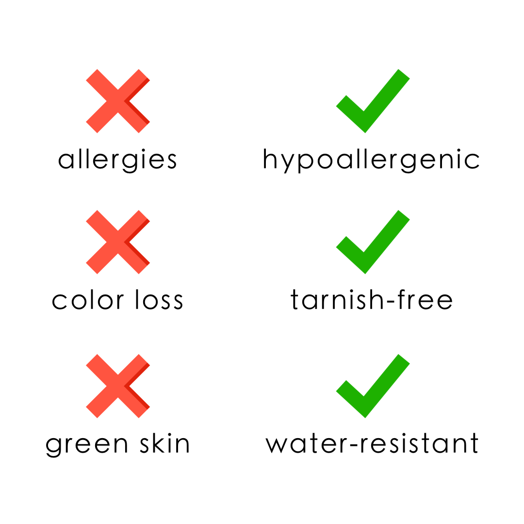 - Water, sweat, and heat resistant. (No discolouration, no tarnishing).